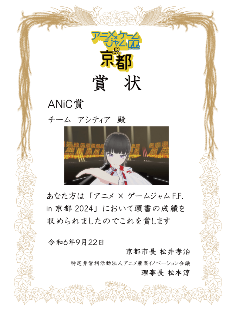 【アニメ×ゲームジャム F.F. in 京都】賞状NFT ANiC賞 チーム アシティア 殿