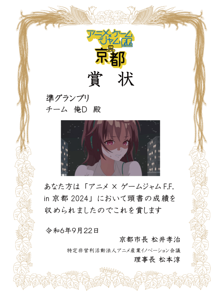 【アニメ×ゲームジャム F.F. in 京都】賞状NFT 準グランプリ チーム 俺D 殿