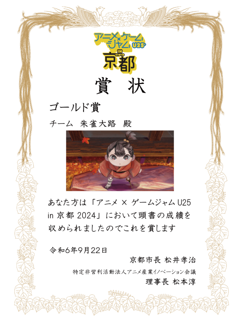 【アニメ×ゲームジャム U25 in 京都】賞状NFT ゴールド賞 チーム 朱雀大路 殿