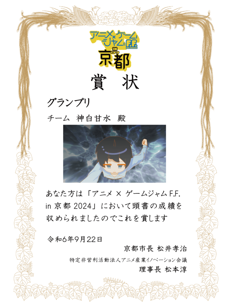 【アニメ×ゲームジャム F.F. in 京都】賞状NFT グランプリ チーム 神白甘水 殿