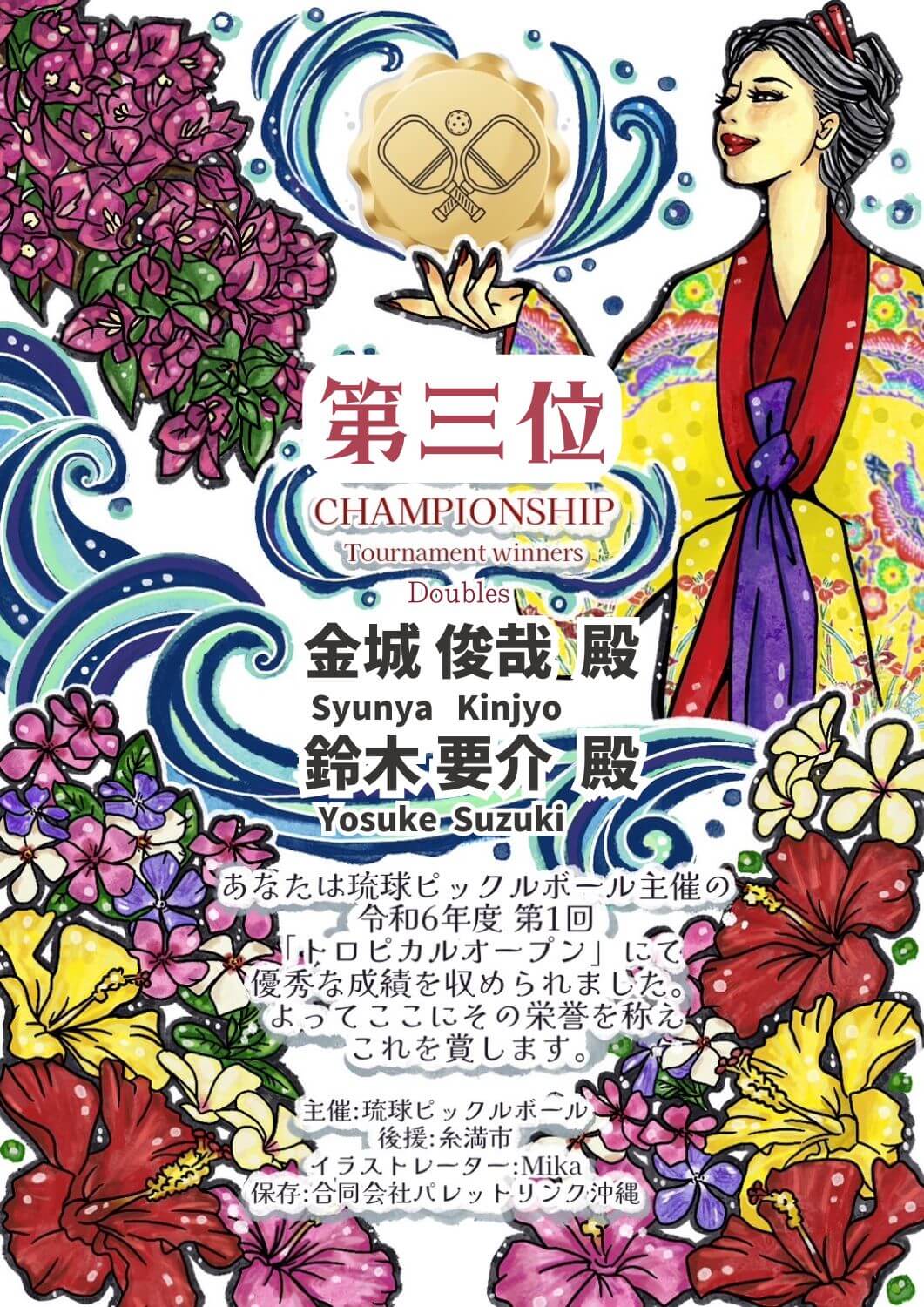 RPB004 2024.03.31 第1回トロピカルオープン賞状NFT【第三位:金城 俊哉 殿&鈴木 要介 殿】