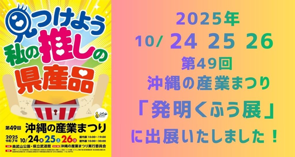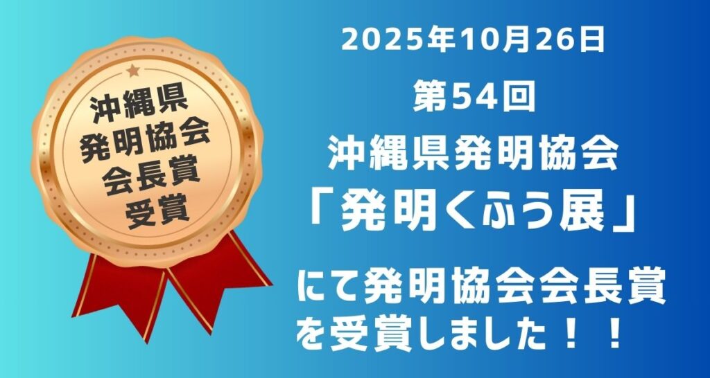 2025年10月24~26日、奥武山公園にて、第49回沖縄の産業まつりが開催されました!また、弊社は、その中で沖縄県発明協会が主催する、第54回「発明くふう展」…